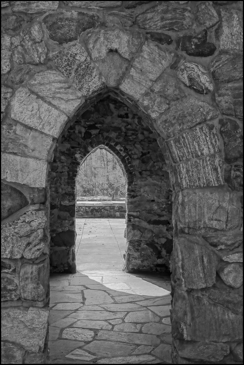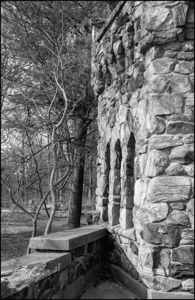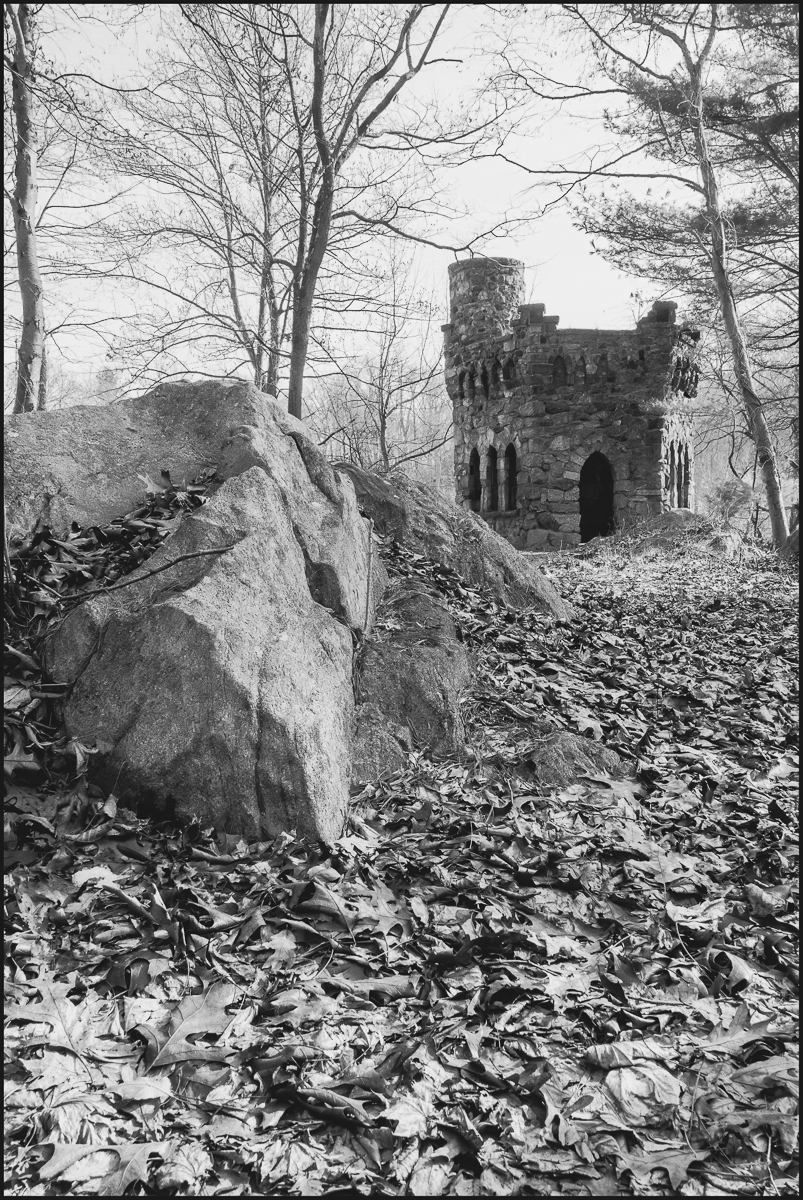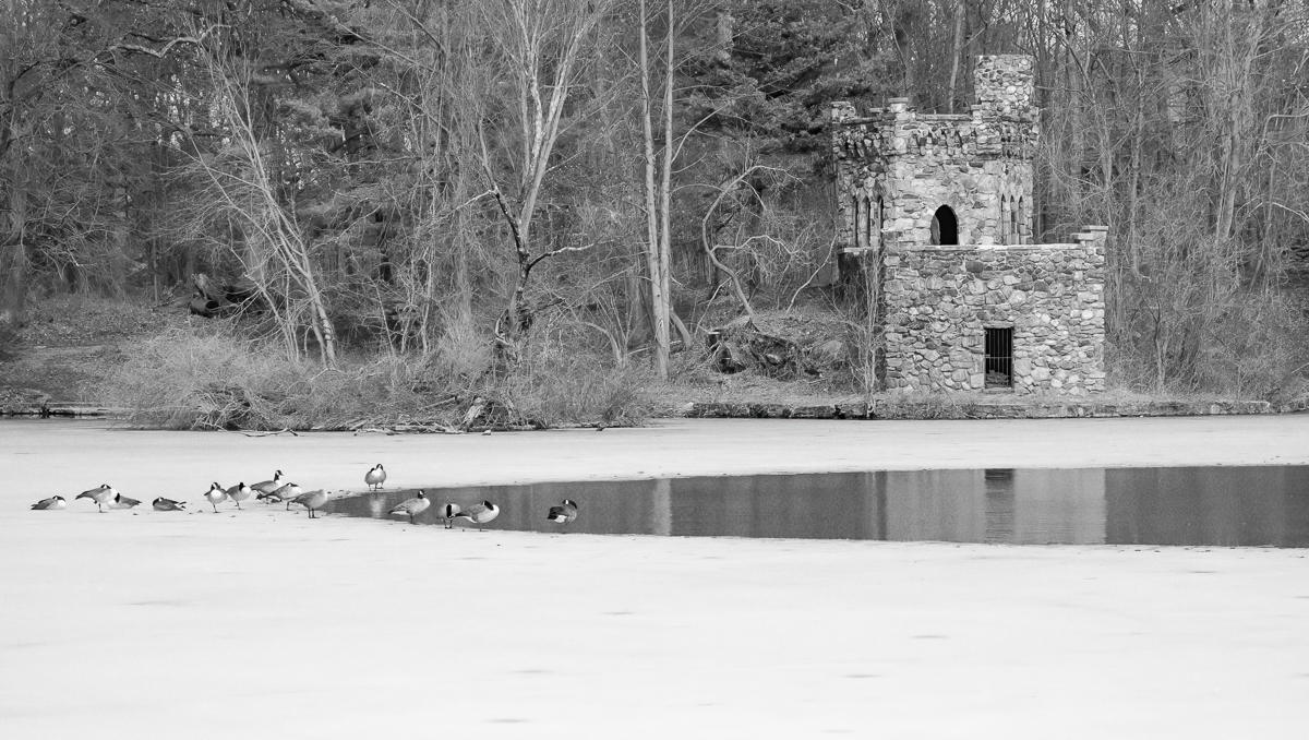 Beltzhoover Teahouse, the last remaining structure of the once-grand estate, is a little turn-of-the-century castle, with an open hexagonal tower featuring gothic arched windows and a roof terrace overlooking Halsey Pond.