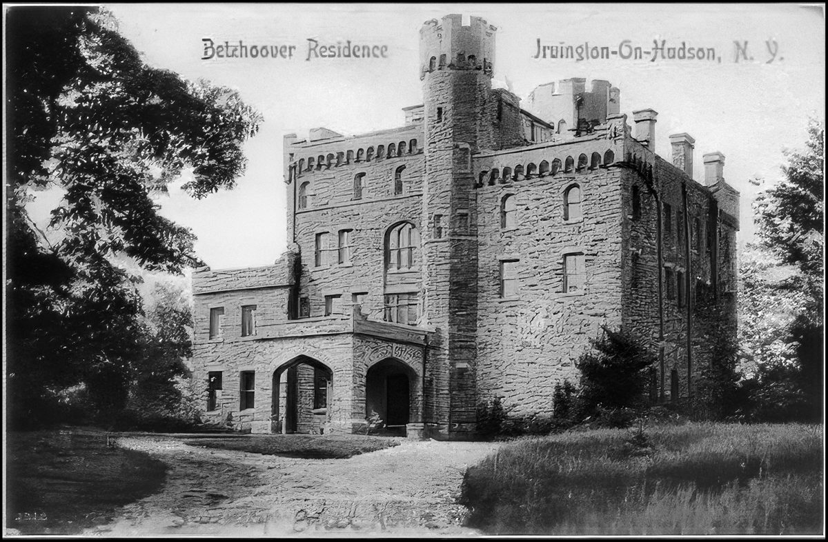 Rochroane castle was built between 1902 and 1905 for Melchior S. Beltzhoover, an oil and cotton magnate from Natchez, Mississippi. The 44-room stone castle, once part of a 200-acre estate overlooking the Hudson River, was designed by Arthur. J. Manning, a New York City architect who also lived in Irvington. The stone was quarried from the land upon which it was built. This “Rhine castle” featured a spectacular stained-glass window by Louis Comfort Tiffany that depicted the Hudson River view as seen from the castle.