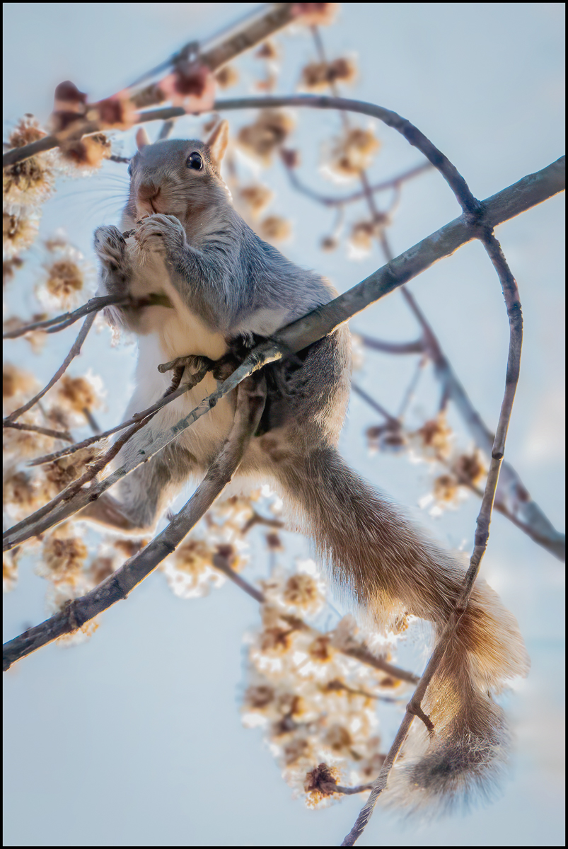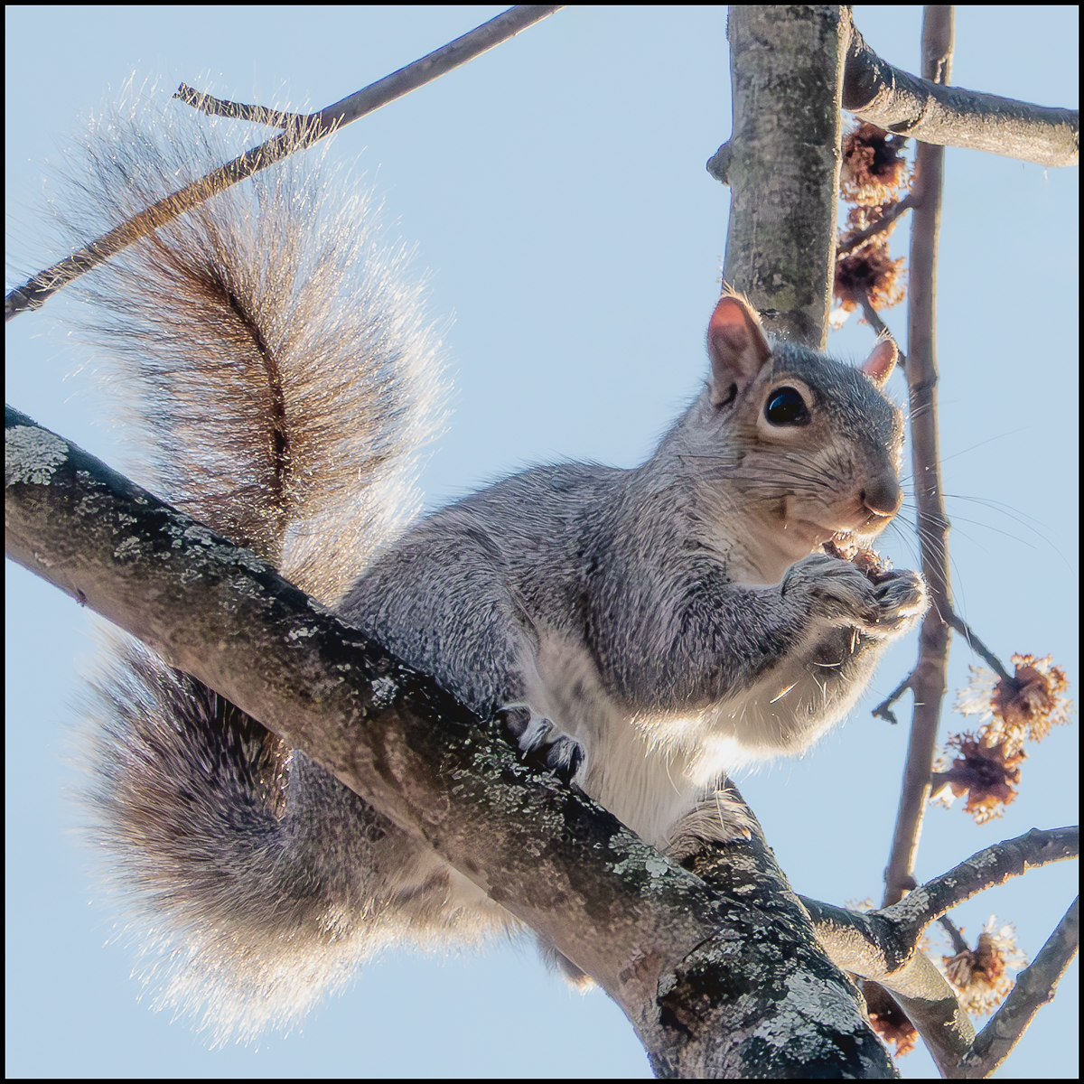 It was nice and warm when I got home a couple of days ago. I decided to laze around on the deck outside my bedroom and watch the world go by. After a while I noticed the sound of movement in a nearby tree. It turned out to be a squirrel eating the newly emerging leaves.