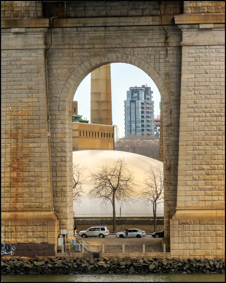 A lot different from the other pictures I took of the bridge. Here I was more or less under it. I like the way the stonework framed the cars and the tree and the buildings in the background. It’s not easy to see, but the woman standing in front of the silver car is looking through either a camera lens, or binoculars – right at me.