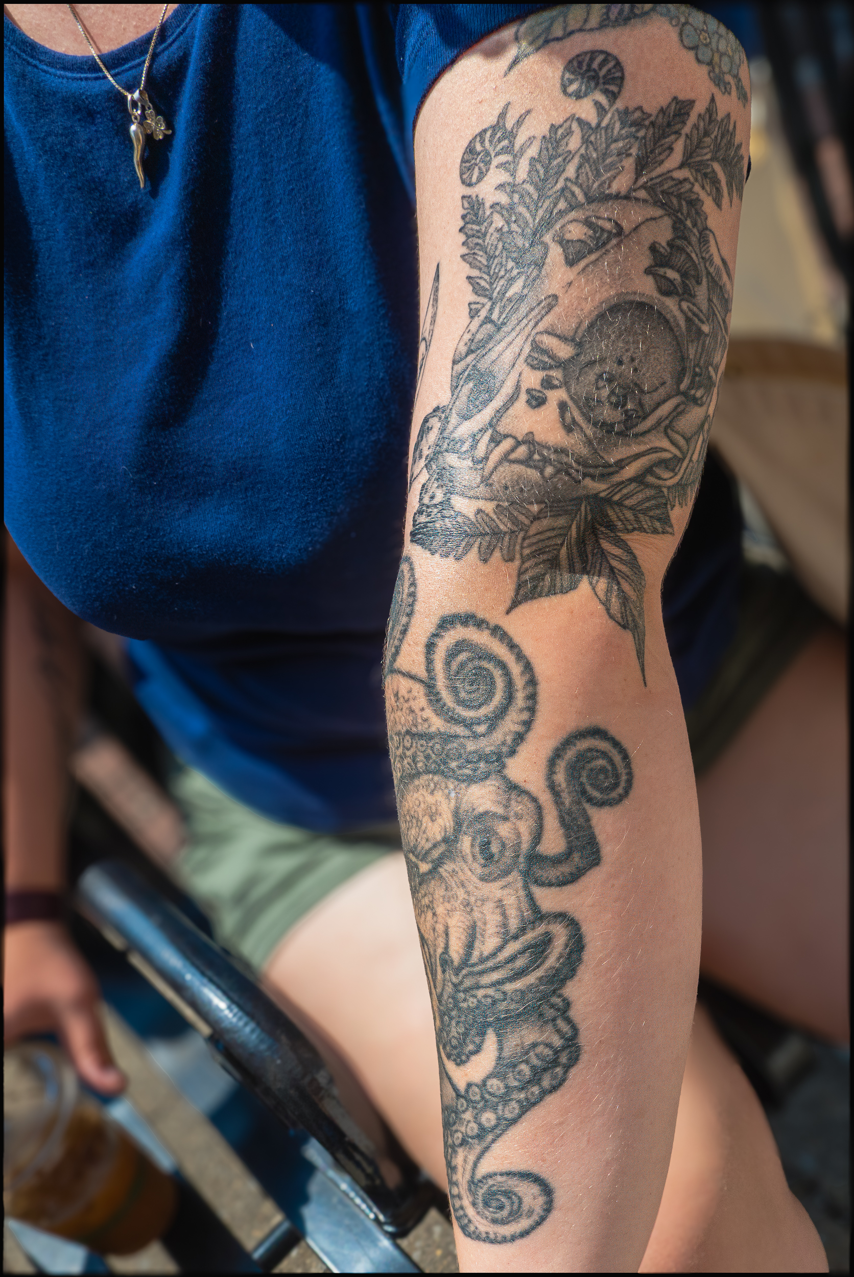 These tattoos were on the arm of the partner/wife/girlfriend of the guy in the previous post. Once again, I found them interesting and asked if I could take a picture. As you can see, she agreed.