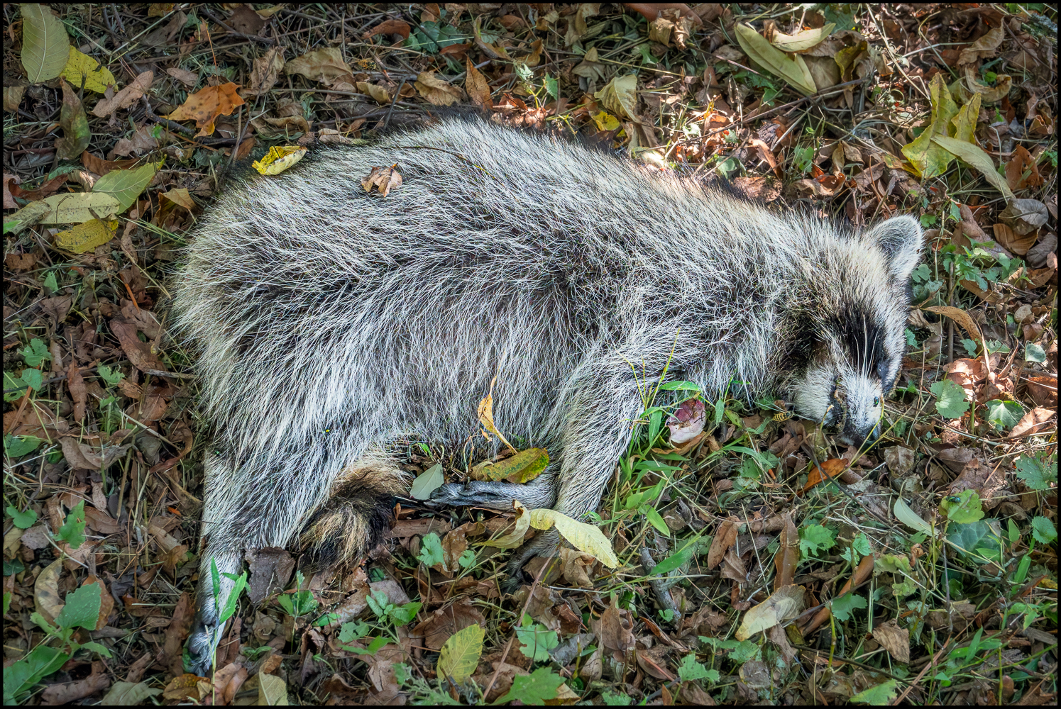 Well, here’s another one. When I came home the other day, I noticed this dead raccoon next to my driveway. It was close to the road so I suppose it could have been hit by a car hard enough to knock into my driveway. Or it could have been hit by a car and crawled as far as my driveway. Or it could have died from natural causes. I’ll never know.