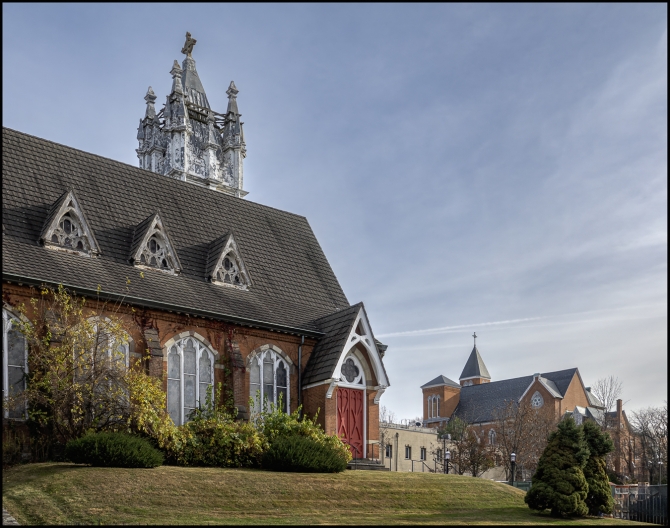 Architectural Style: High Victorian Gothic (1860s-1890s)High Victorian Gothic architecture, which evolved from the older Gothic Revival style, differs from that style in its use of contrasting polychromatic bands on the exterior wall surfaces and more elaborate decorative elements. This style was usually reserved for public buildings such as schools or churches. As it is related to Gothic Revival architecture, structures in this style also contain such elements as steeply pitched rooflines, elaborate ornamentation, and a predominantly vertical orientation.