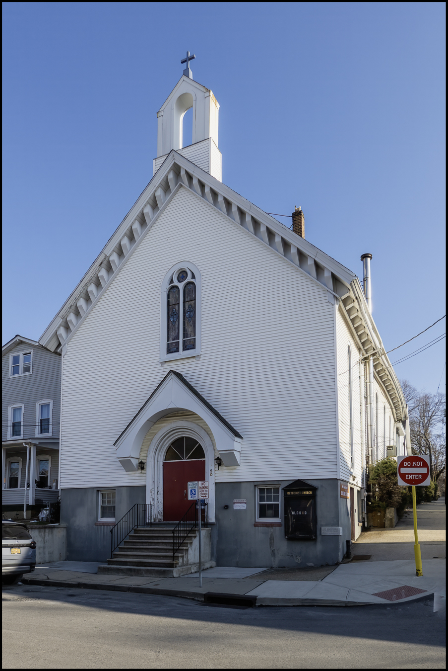 The United Methodist Church, located at 1 Emwilton Place and constructed from 1877 to 1885, was built to house the Sing Sing Methodist Congregation and was originally known as the Sing Sing Union Chapel. Before the church was built, the congregation utilized a space on Spring Street that had become too small as the congregation expanded in size, so the decision was made to build a new church on a site located on the corner of Emwilton Place and South Highland Avenue. A chief sponsor of the new church’s construction was Henry J. Baker, who built Highland Cottage Baker helped raise $30,000 toward the church but died in 1878, a year after the start of construction. His body was initially buried underneath the main vestibule at the base of the tower in 1878 but was removed in 1893 at the request of his family. Following Baker’s passing, the lack of funds and higher than expected construction costs delayed completion of the building, which sat unfinished for eight years until finally completed in 1885. The church was built from white marble obtained from the Snowflake quarry in Thornwood, and the marble was carted to the site by a team of oxen. One of the stained-glass windows was created and signed by Louis Comfort Tiffany (1848-1933), famed glassmaker and owner of Tiffany Glass and Decorating Company of New York City.