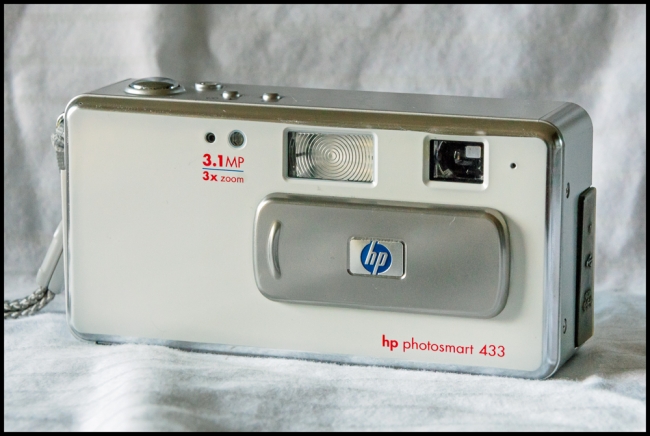 It’s a HP photosmart 433 and it was given to me by a friend. It’s quite small (4.6in x 2.2 in x 1.5in deep) and light (0.44lbs) and has a 3.1 megapixel, 1/27 inch CCD sensor and uses standard AA batteries.