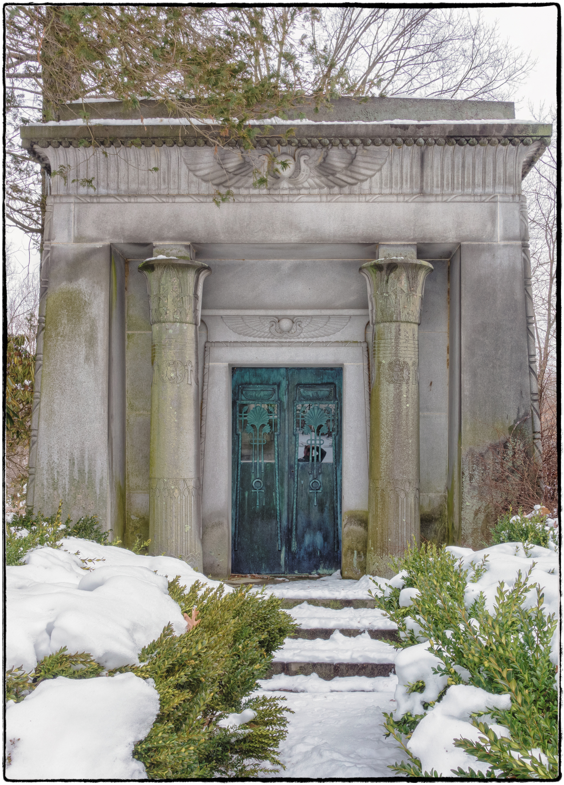 Not too long ago I would probably have walked right past this mausoleum. Compared to many others in Sleepy Hollow Cemetery it’s quite small, and from a distance, hidden behind hedges it doesn’t seem to be anything special.