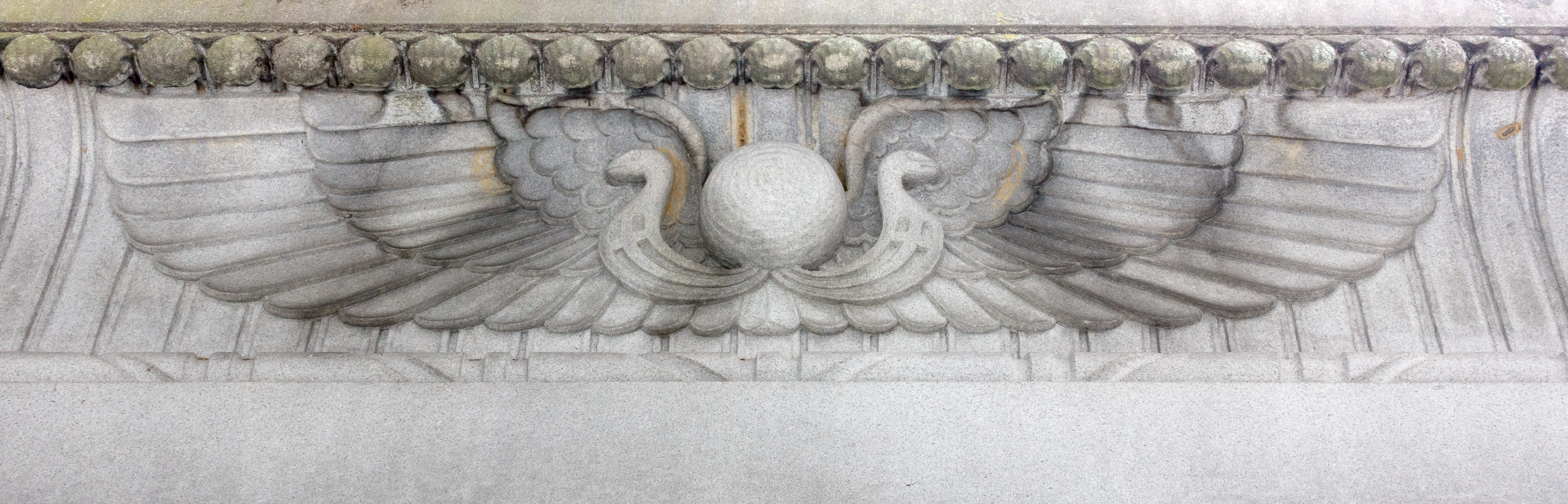 Pair of vulture wings sprouting from a circle (symbolizing the sun) and flanked by two cobras (symbolizing death). Behind the winds is a cavetto cornice (seen more clearly in the first picture above), which goes around the entire structure.