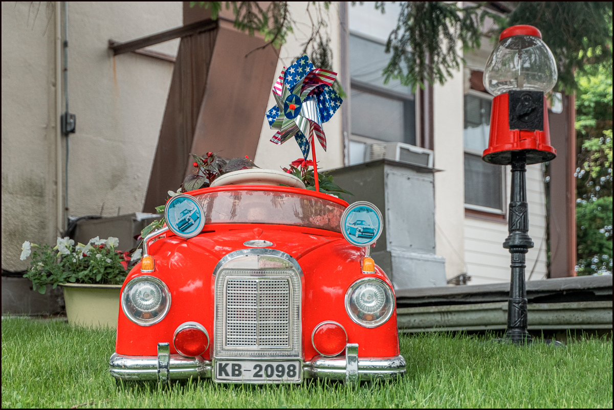 This garden is outside a popular Japanese restaurant: Sushi Mikes. I’ve heard its very good, but have never eaten there. I think what caught my eye was the eclectic mix of objects in the garden: the car; the empty gumball machine; whatever that thing is with the US flag design that’s behind the car. There were other objects including a grouping of small dog statues, but I couldn’t fit them all in.