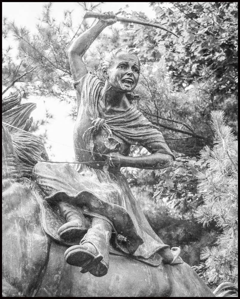 Her bronze statue depicts Sybil on horseback, screaming, and waving the stick that she used to knock on doors and whack highwaymen who got in her way. It was sculpted by Anna Hyatt Huntington, and dedicated on June 3, 1961.