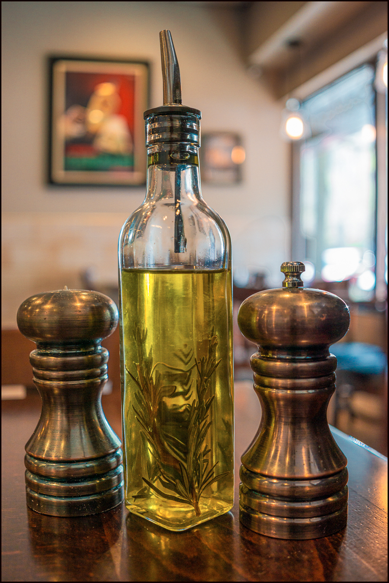 I was sitting having lunch in one of our local eateries (Donato’s Trattoria in Briarcliff Manor, NY) when I noticed the olive oil with rosemary (I think) inside it and thought it might make an interesting picture. I rearranged the salt and pepper shakers a bit and this is the result.