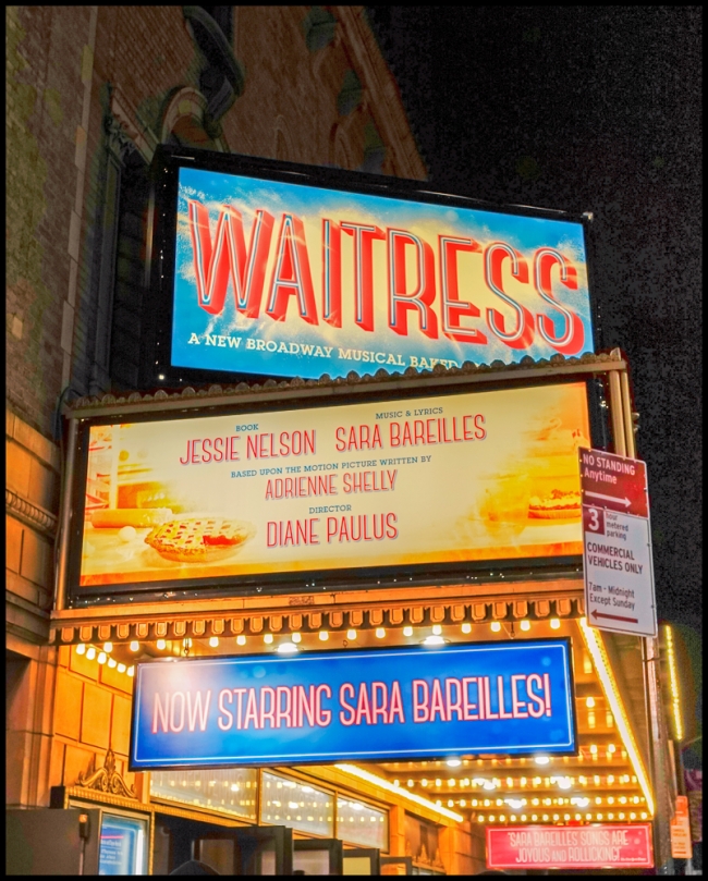 Then on to the play: Waitress, perhaps not the greatest play I’ve ever seen, but still thoroughly entertaining in a lightweight kind of way. As you can see from the marquee, the show starred Sarah Bareilles who also wrote the music and lyrics. Clearly a talented person.