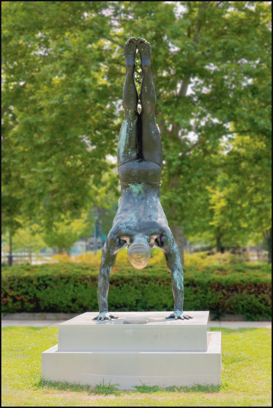 Above a scale model of The Sphere which once stood in the World Trade Center complex. As the only piece of iconic artwork to survive the 9/11 attacks, it became a symbol of strength, survival and resilience and reflected “the tenacious spirit of all those affected,”. Like the United States after the fateful event, the Sphere emerged “very bruised, much broken, but not defeated.” On March 11, 2002, the Sphere was erected in Battery Park as the first official memorial to the victims of 9/11 in New York City. The Port Authority voted in 2016 to return it to World Trade Center site.