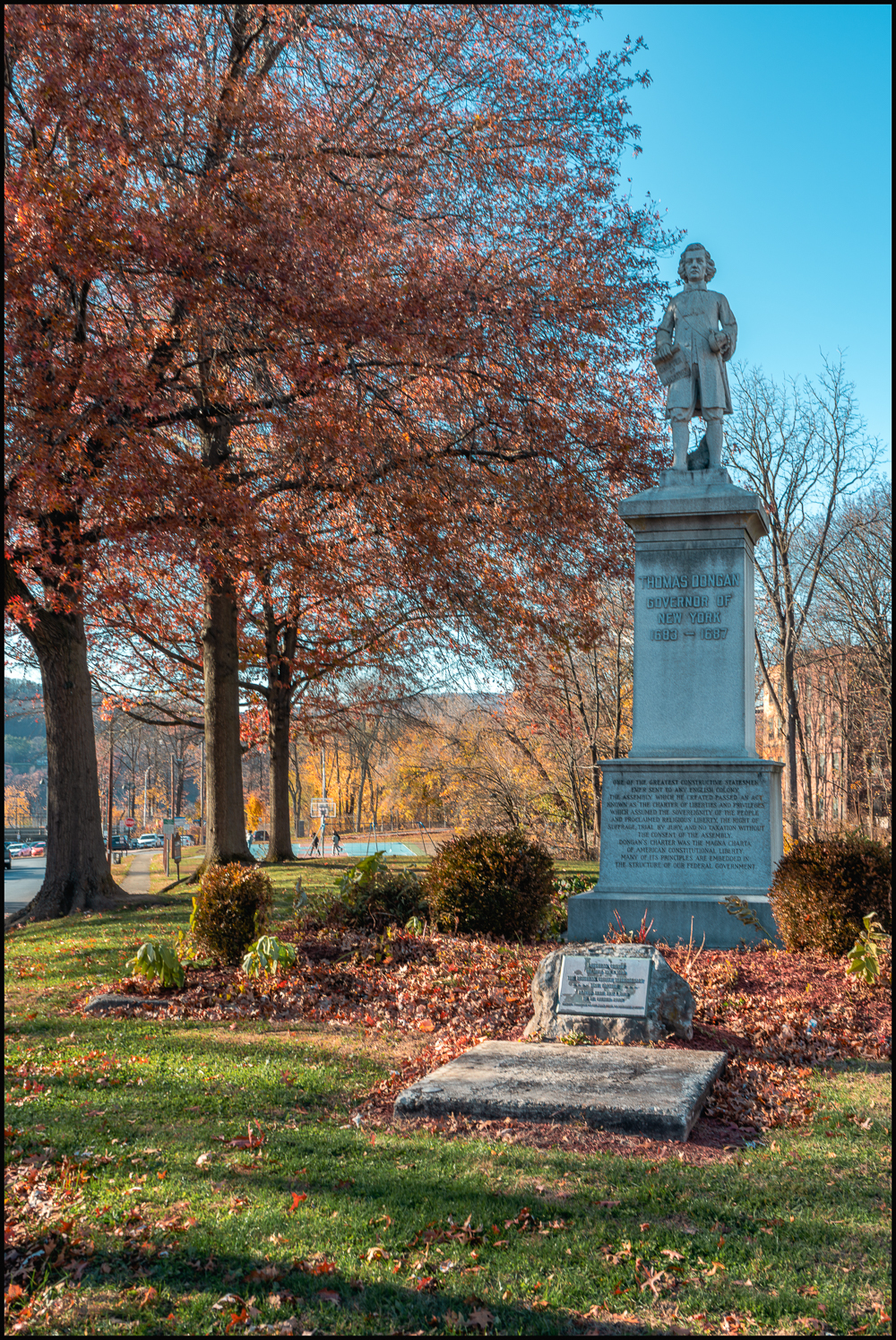 Thomas Dongan (1634 – 1715), Second Earl of Limerick, was Royal Governor of the Province of New York 1683 – 1687. His significance to the province and to the structure of the United States is described in the inscription in the base: